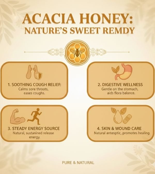 Acacia Honey is a pure, light honey derived from the blossoms of the Acacia tree. With its delicate flavor and high fructose content, it’s perfect for soothing sore throats, promoting digestive health, and adding a touch of sweetness to your food.