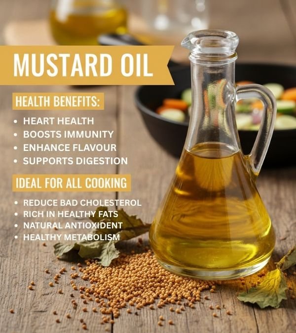 Cold-pressed mustard oil is a flavorful cooking oil with a sharp, pungent taste that enhances dishes. Rich in monounsaturated fatty acids, antioxidants, and essential omega-3 fatty acids, it promotes heart health and adds a distinctive kick to your meals.