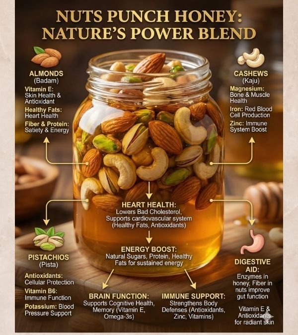 Nuts Punch Honey is an exciting fusion of pure honey combined with a variety of nutrient-dense nuts. Packed with vitamins, minerals, and healthy fats, this honey is perfect for a natural energy boost while supporting heart health and overall vitality.